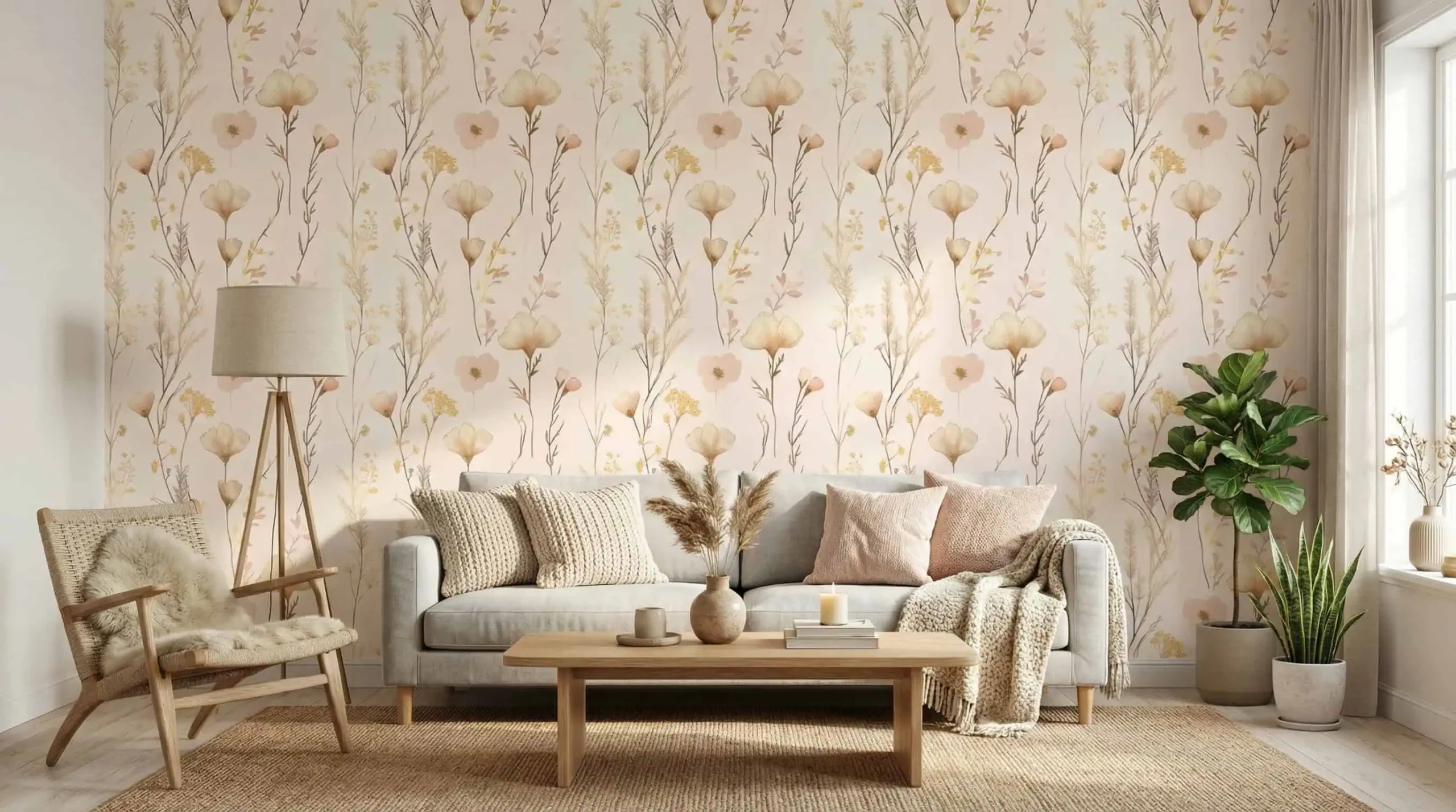 ✔ Woonkamer — Gebruik dit bloemen behang als accent muur achter de bank. Combineer met een lichte stoffen bank in crème of zandkleur, een salontafel in licht hout en kussens in zacht roze en goud. Verf de overige muren in warm wit of licht linnen om het patroon subtiel te laten spreken.