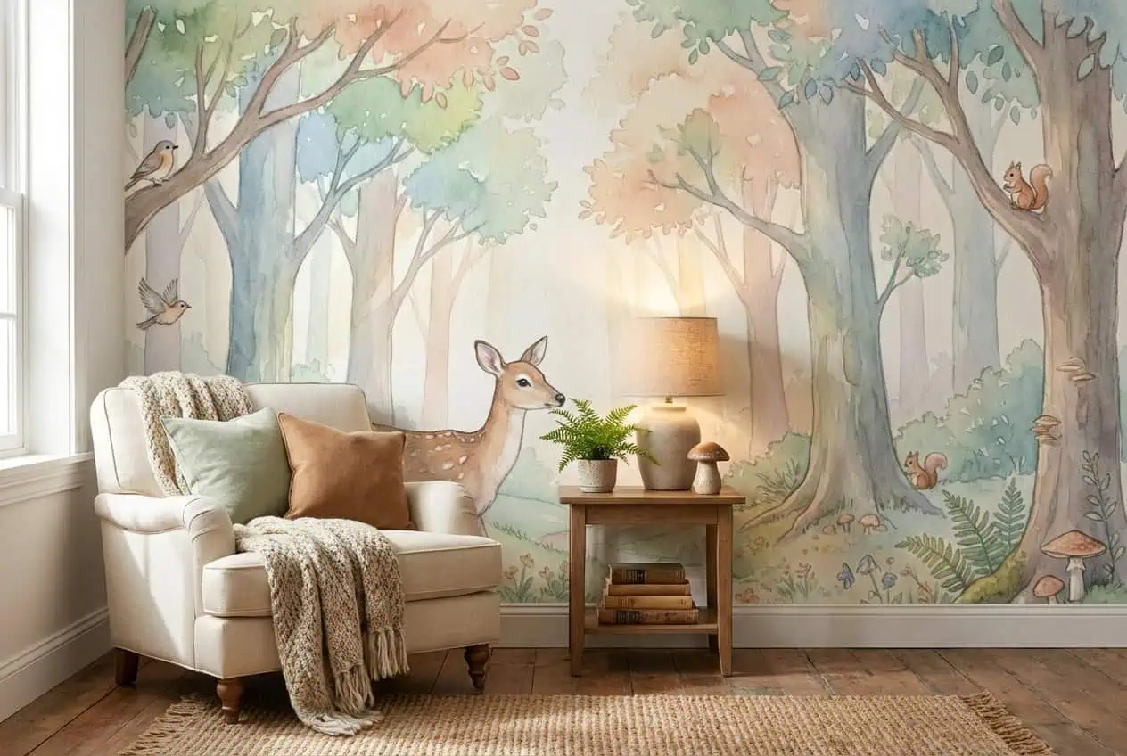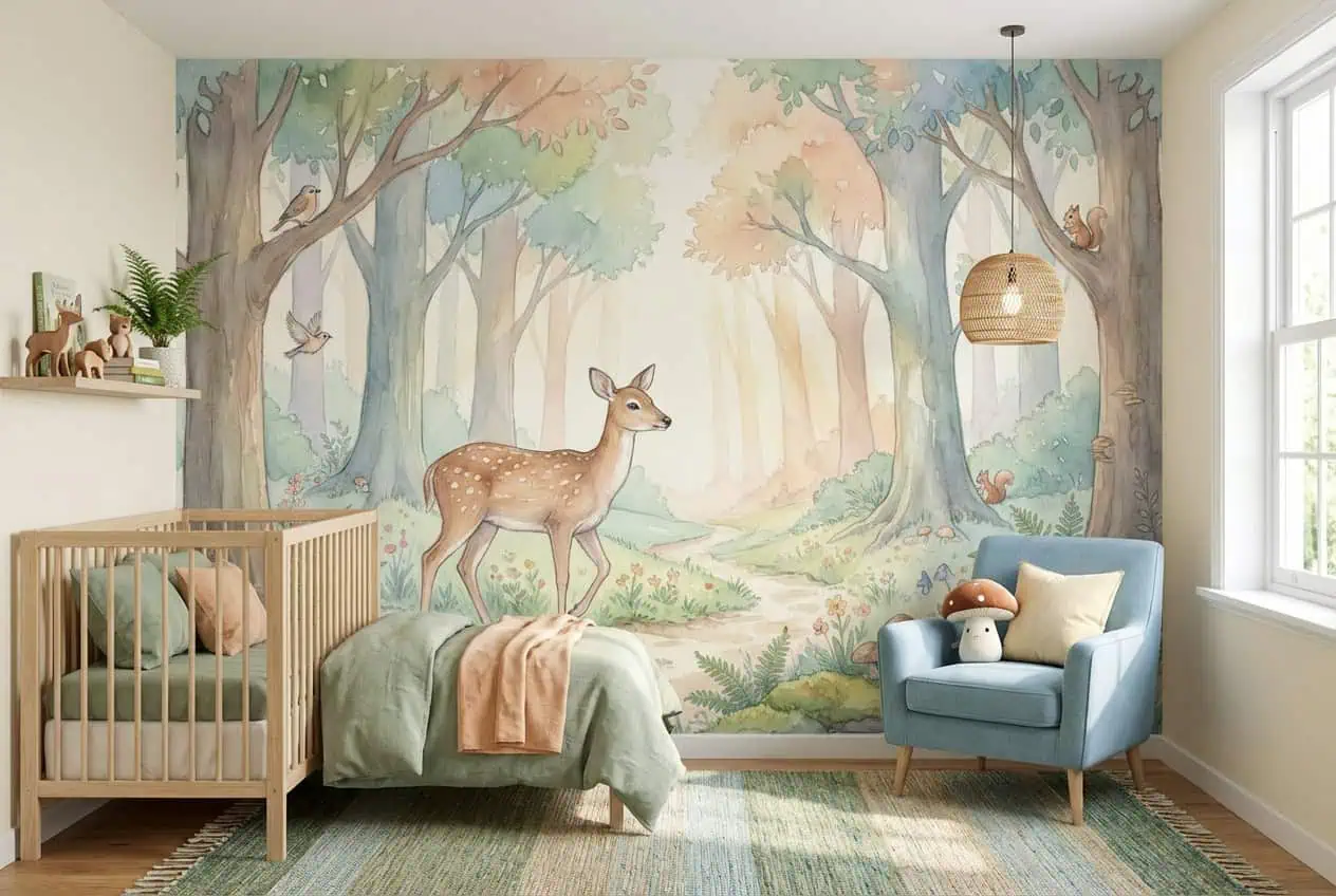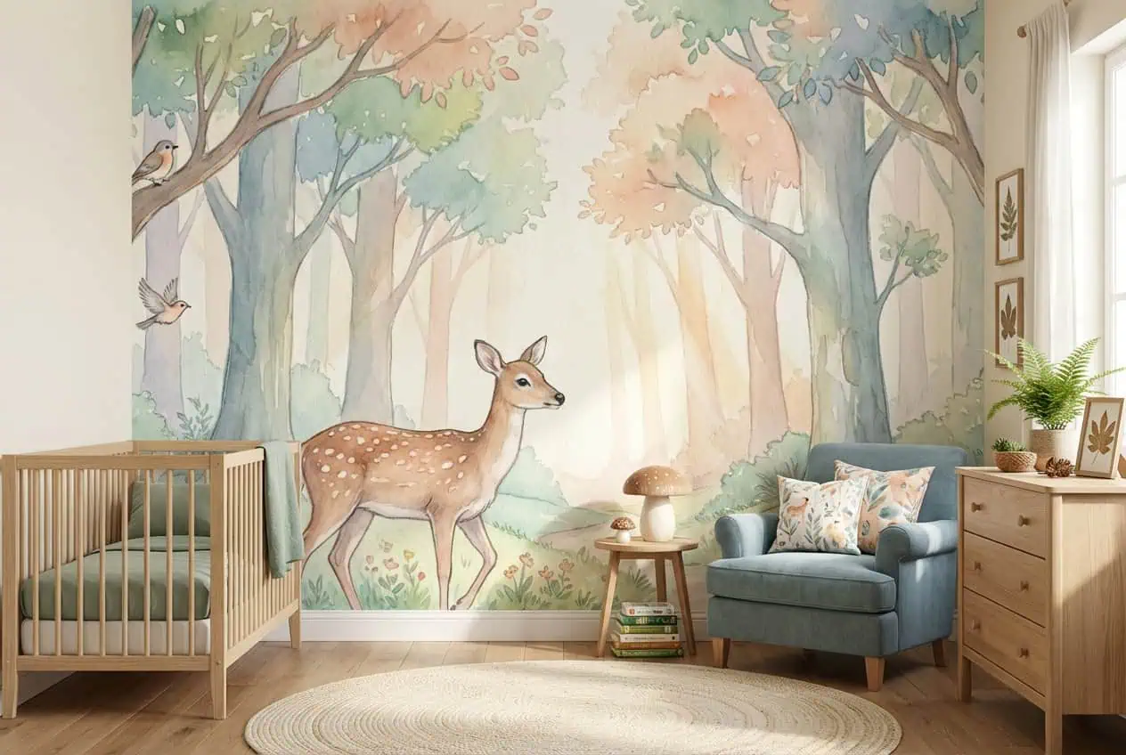 ✔ Speelhoek — Ook in een speelhoek of speelhoekje in de woonkamer zorgt dit bos behang hert pastel voor een rustige, vrolijke achtergrond waar kinderen tot rust komen.