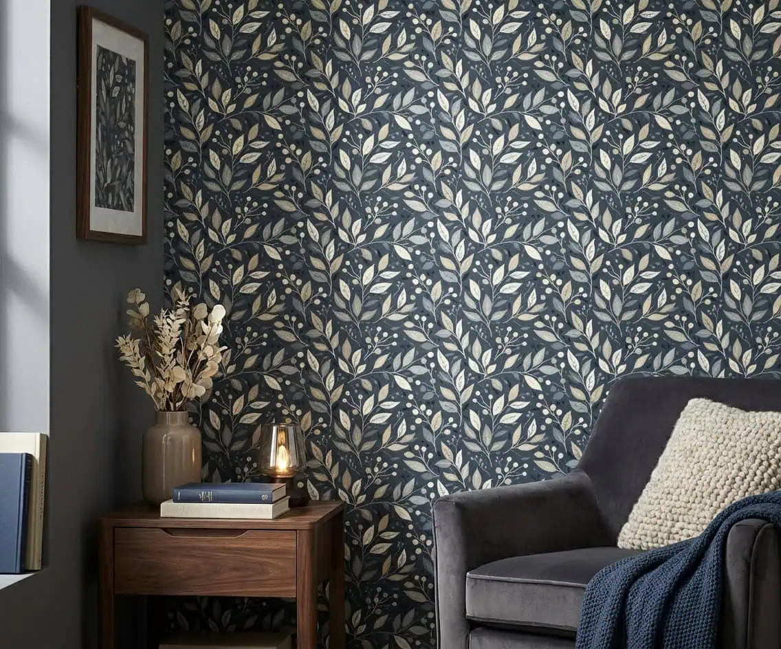 ✔ Woonkamer — Gebruik dit botanisch behang als accentwand achter je bank of in een leeshoek voor een uitnodigende, sfeervolle look. De diepe kleuren zorgen voor een knusse, maar toch frisse basis.
