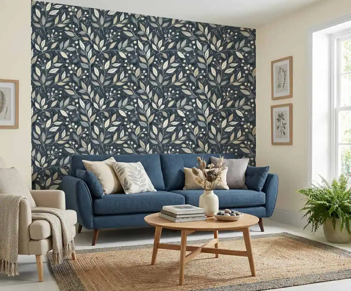 De diepe blauwgrijze kleur van dit blauwgrijs behang zorgt voor een stijlvolle basis in elk interieur. De zachte beige bladeren en subtiele bessen geven het geheel een licht en luchtig effect, terwijl de grafische lijnen het design modern houden. Door de matte afwerking ontstaat er een mooie balans tussen warmte en frisheid. Dit patroon past moeiteloos bij: