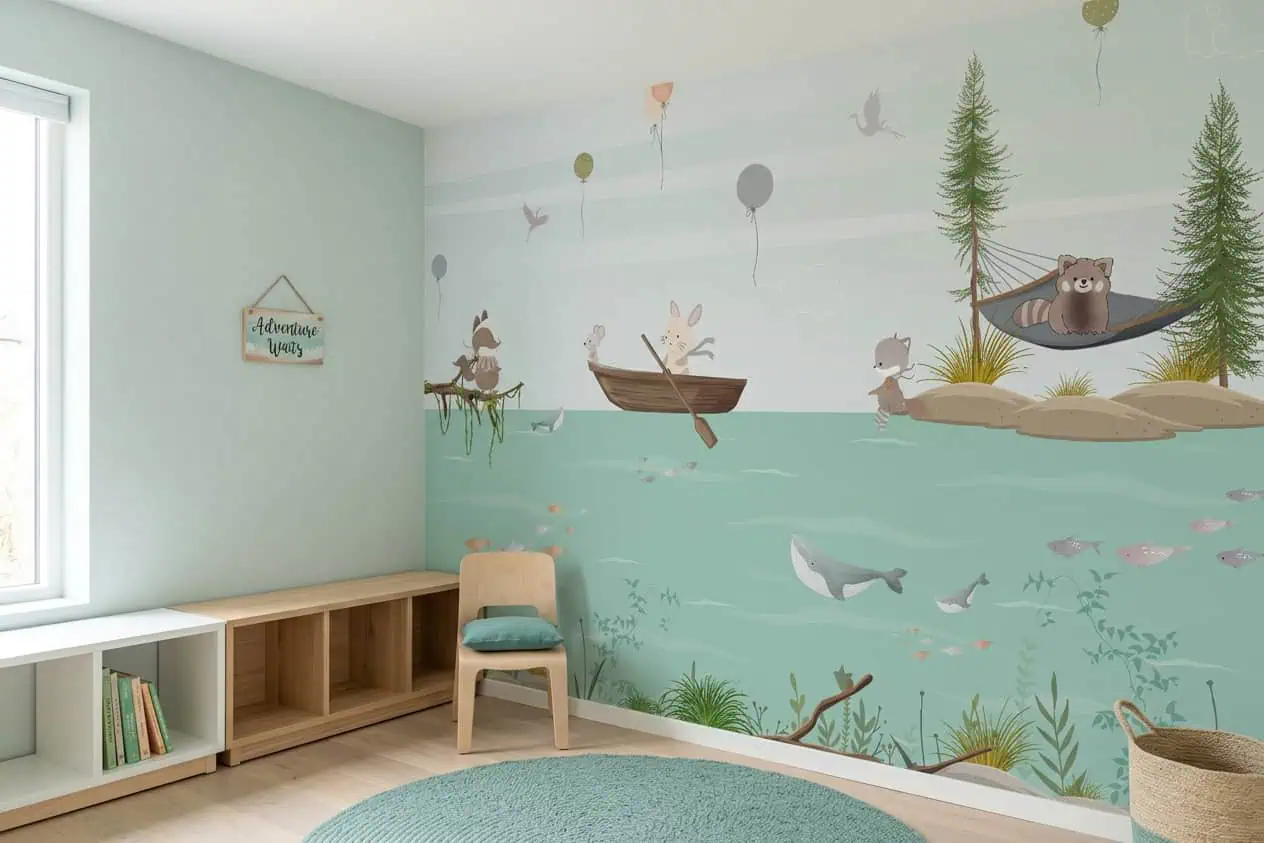 Het dieren behang pastelgroen brengt de magie van een avontuurlijke dag aan het water naar je kinderkamer. Je ziet een vrolijke scene met een konijntje in een roeiboot, nieuwsgierige bosdieren aan de oever en een relaxte wasbeer in een hangmat. Onder het zachtgroene water zwemmen vissen en een vriendelijke walvis, terwijl boven de dieren pastelkleurige ballonnen zweven. Het geheel ademt rust, fantasie en een zachte Scandinavische sfeer. Ideaal voor wie een liefdevolle, unieke basis zoekt voor een speelse én rustgevende ruimte. Alle fotobehang wordt op maat geproduceerd en professioneel gemonteerd door echte vakmensen, zodat je altijd verzekerd bent van een perfect resultaat zonder naden.