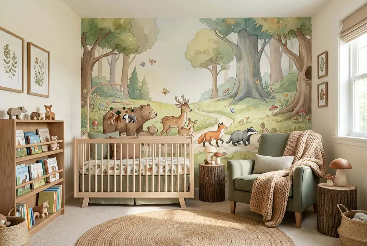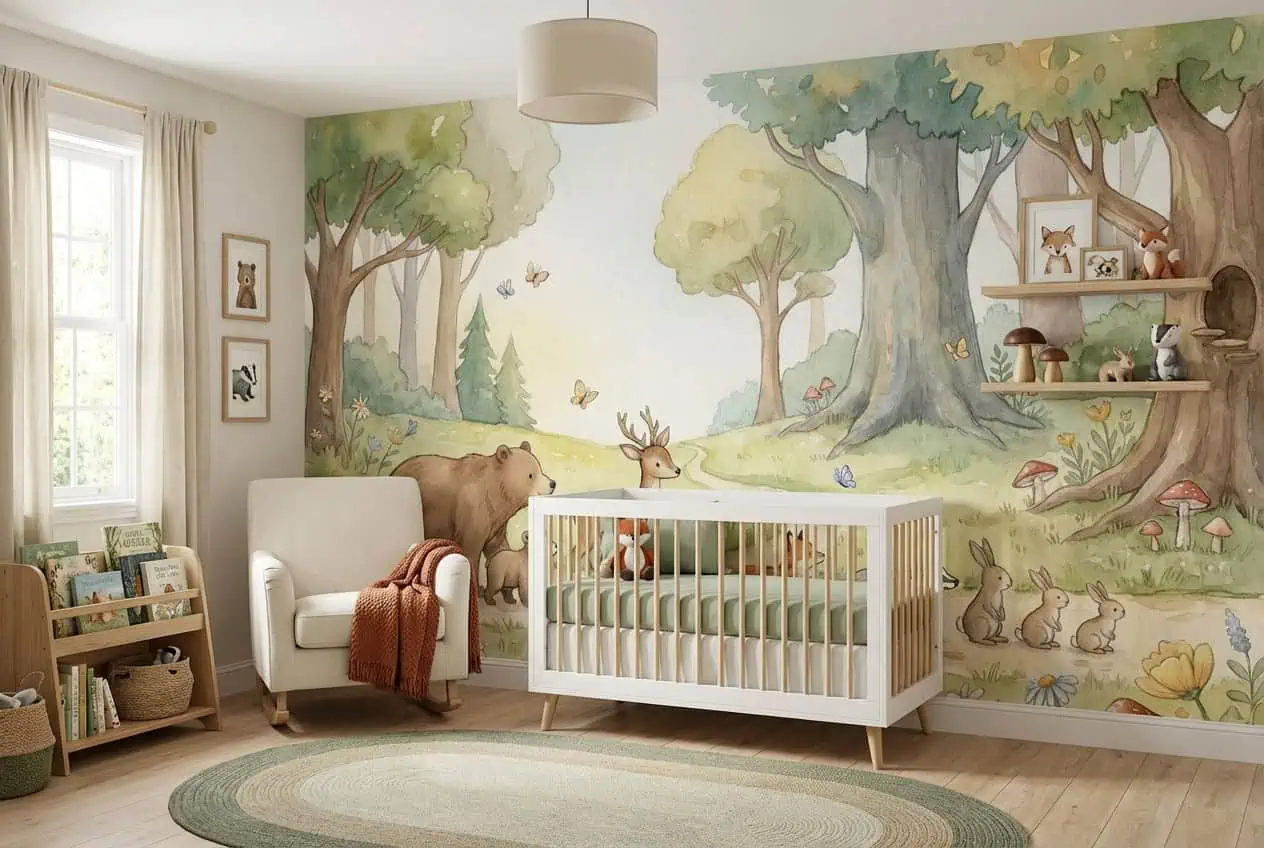 ✔ Speelhoek — Creëer een avontuurlijke speelwand waar kinderen hun eigen bosverhalen kunnen verzinnen. Dit behang is ook een geweldige achtergrond voor leeshoekjes of een knutselplek.