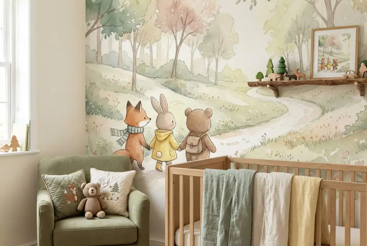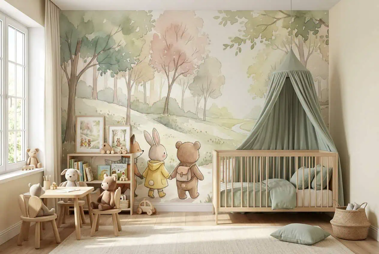 Dieren behang pastelwandeling is als een verhaal aan je muur. Je ziet drie bosvriendjes – een vos, een konijn en een beer – samen hand in hand op avontuur in een zacht, pastelkleurig bos. Het eerste wat opvalt is de sprookjesachtige sfeer, die meteen rust en geborgenheid uitstraalt. Ideaal voor de kinderkamer of babykamer waar fantasie en veiligheid samenkomen. Dit fotobehang wordt altijd op maat gemaakt en vakkundig gemonteerd door echte vakmensen. Zo ben je verzekerd van een perfect resultaat zonder naden of gedoe.