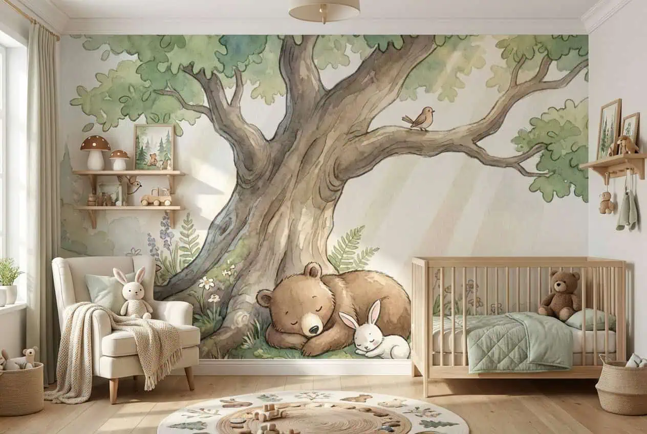 ✔ Babykamer — Het dieren behang sprookjesbos vormt een zachte, dromerige achtergrond bij het wiegje. De rustgevende kleuren zorgen voor kalmte tijdens het slapen en geven warmte aan het interieur.