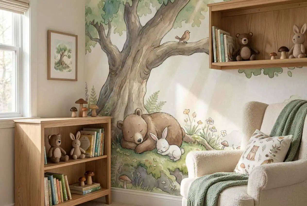 ✔ Speelhoek — Dit dieren behang sprookjesbos geeft een speelhoek direct karakter. Het stimuleert creativiteit en past perfect bij een natuurlijke, rustige speelomgeving.