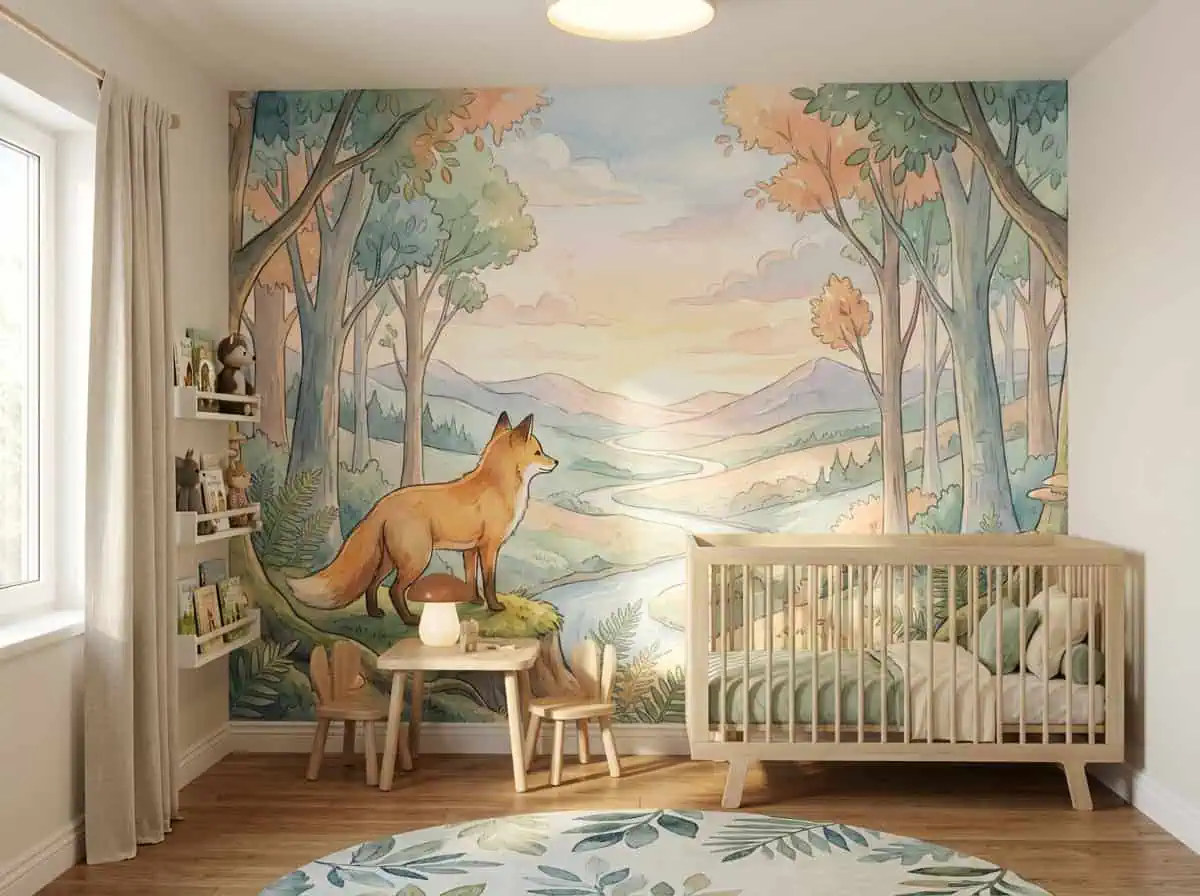 ✔ Speelhoek — Ook in een speelhoek komt het dieren behang vos pastel bos prachtig tot zijn recht. Denk aan een lage speeltafel, zachte vloerkleden en houten dierenfiguren.