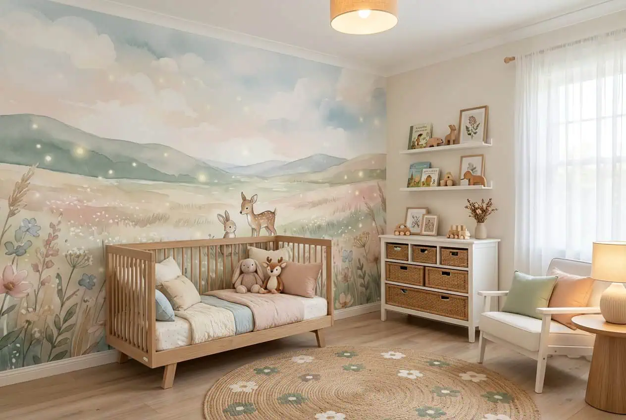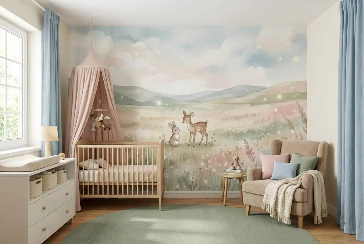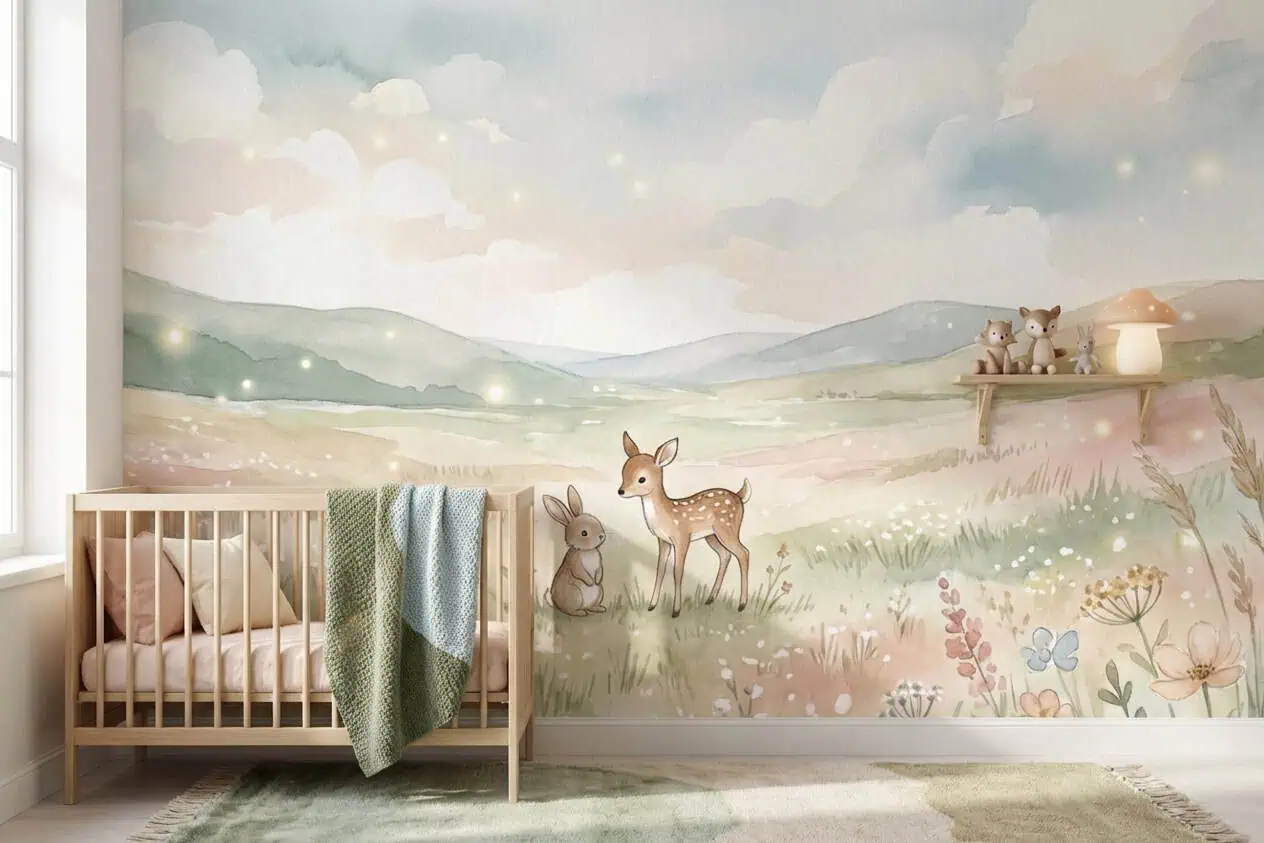Dieren behang pastel met een dromerig weide tafereel van een hertje en konijn. Naadloos vliesbehang op maat, inclusief professionele montage door vakmensen. Ideaal voor een betoverende babykamer of kinderkamer.
