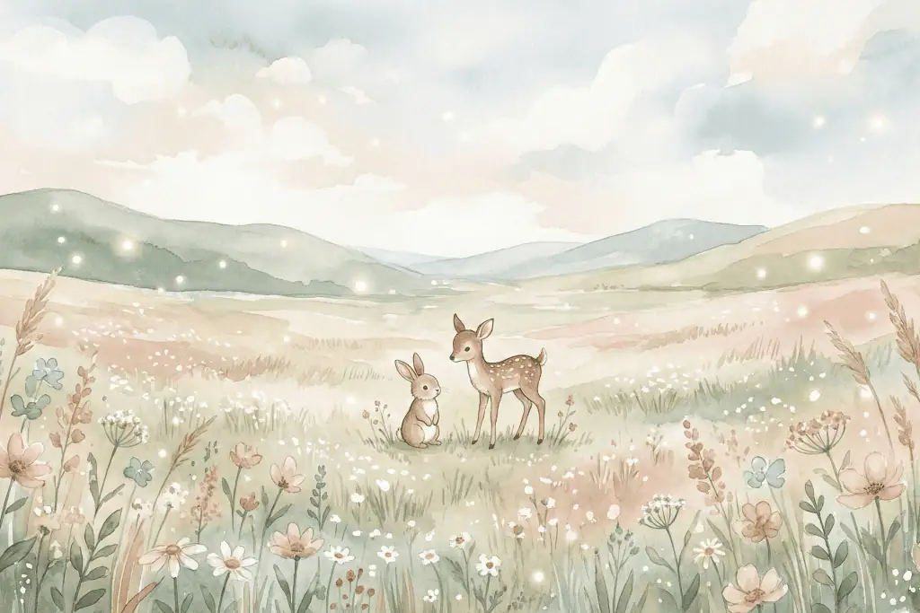 Fotobehang Dromerig Weidelandschap met Hertje en Konijn in Pastel