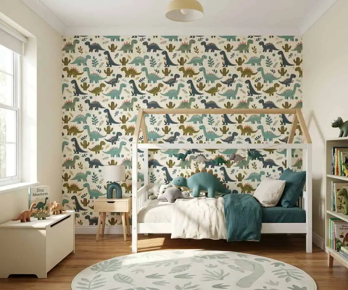 Dino behang groen blauw mosterd brengt een speels avontuur in elke kinderkamer. Dit naadloze vliesbehang op maat wordt professioneel gemonteerd door vakmensen en is ideaal voor een vrolijke accentmuur.