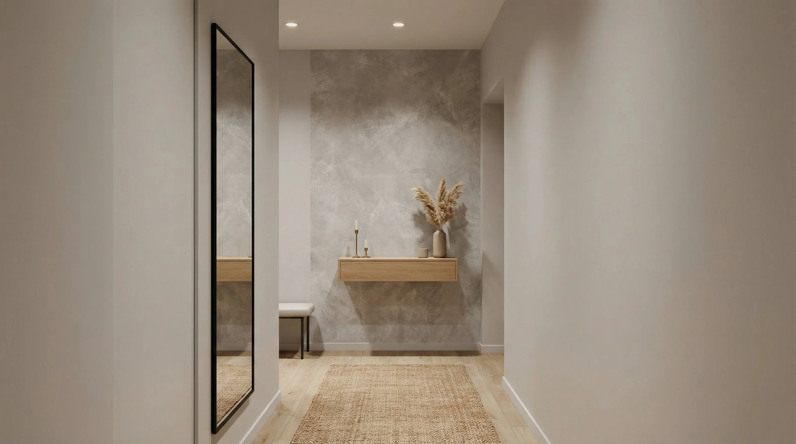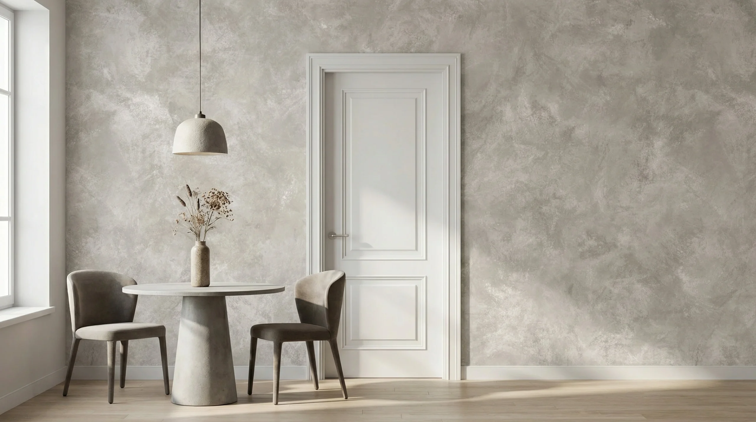 ✔ Hal/Eetkamer — In de hal vormt de betonlook een stijlvol decor achter een slank dressoir of console met een grote vaas en wat droogbloemen. In de eetkamer werkt dit behang prachtig achter een ronde houten tafel en gestoffeerde stoelen in zand- of muisgrijs. Combineer met wanden in warm wit of een heel lichte steenachtige tint om het geheel zacht en uitnodigend te houden.