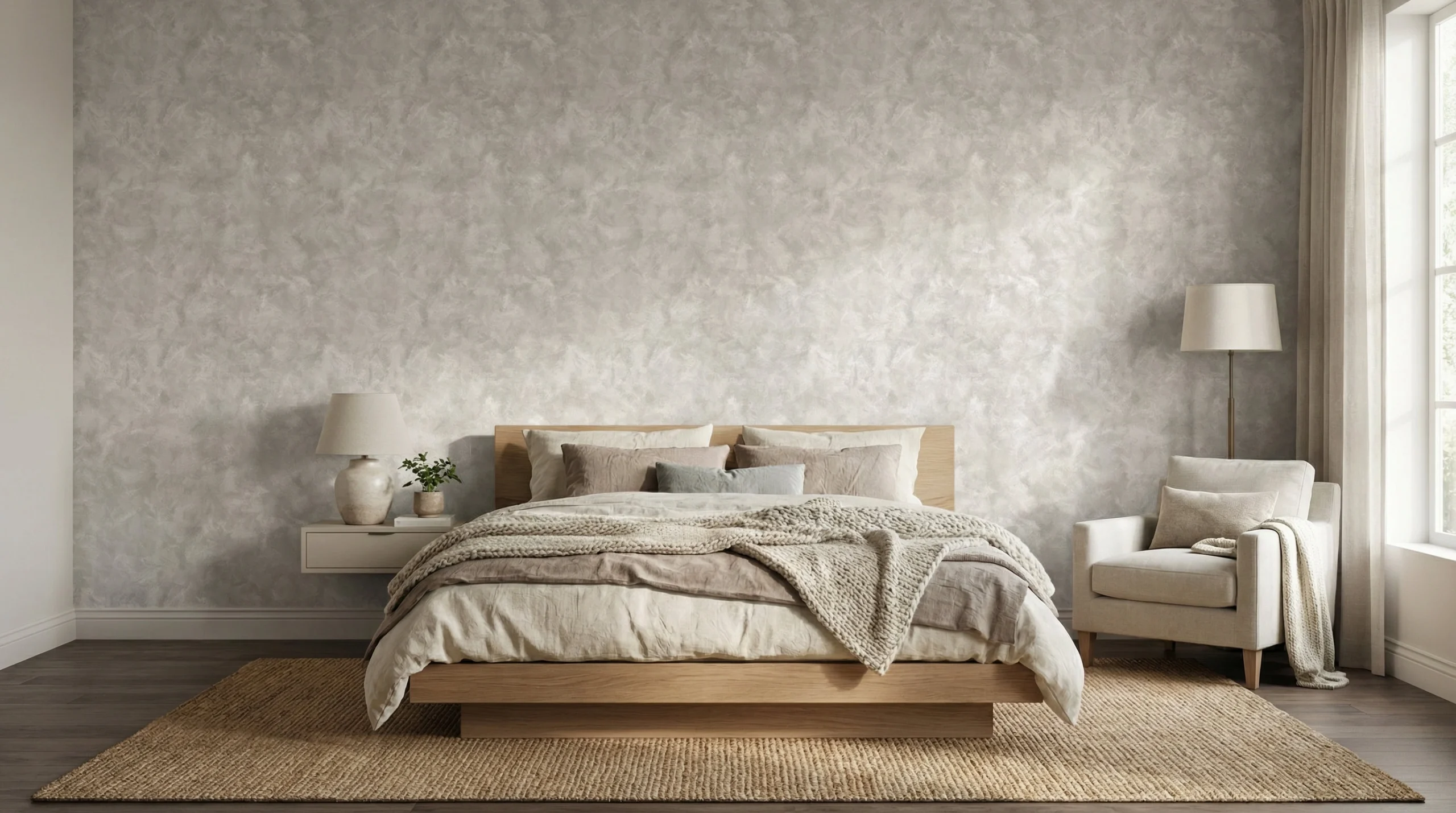 ✔ Slaapkamer — Achter het bed zorgt dit behang voor een kalme hoteluitstraling. Kies voor een houten bedframe, beige of taupekleurig beddengoed en grove gebreide plaids. Laat de rest van de ruimte rustig door te werken met licht greige of zacht taupe op de andere wanden en dunne, luchtige gordijnen.