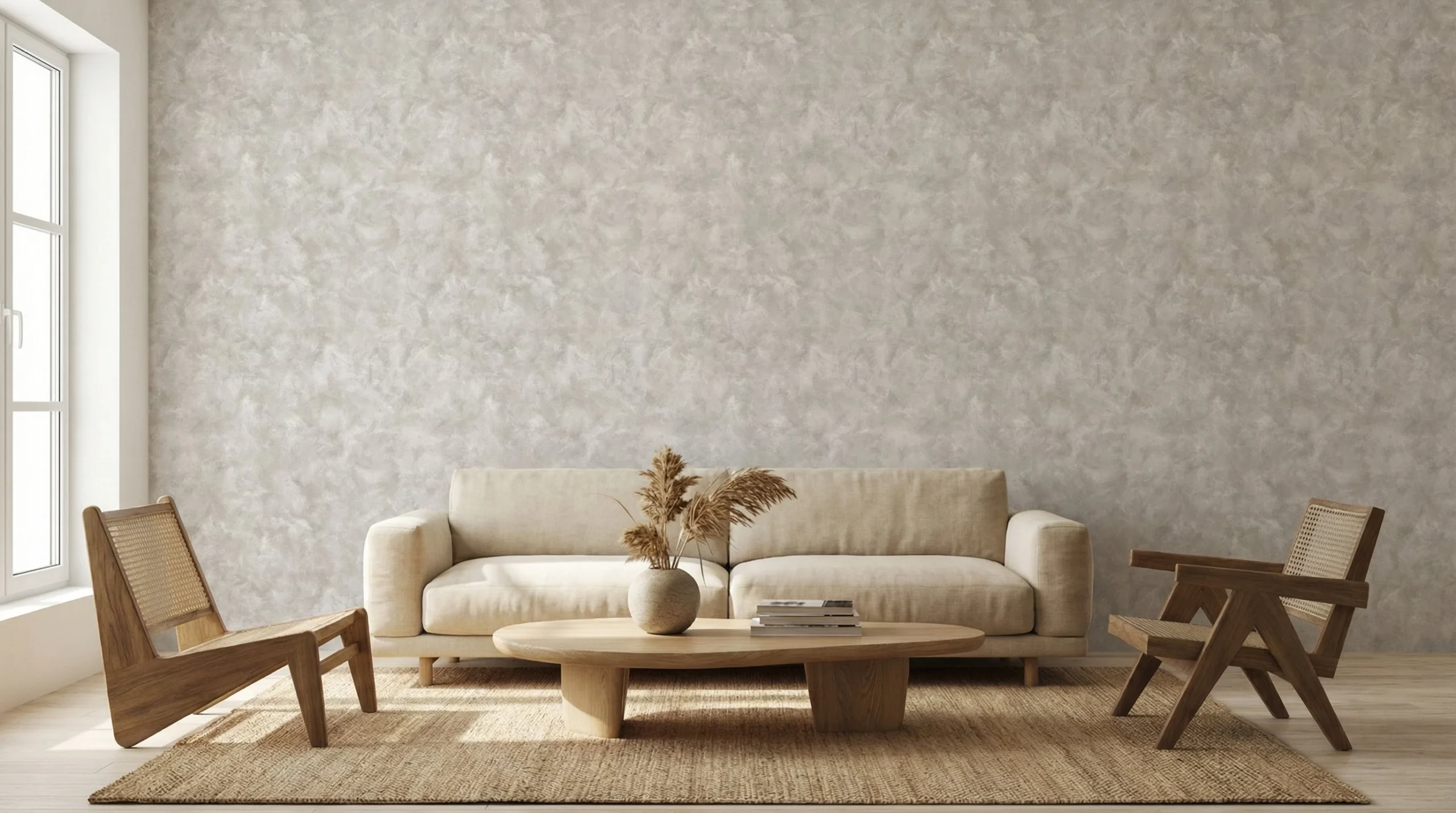✔ Woonkamer — Gebruik dit betonlook behang als grote accentmuur achter de bank. Combineer met een comfortabele zandkleurige bank, een lage houten salontafel en een juten vloerkleed. Verf de overige muren in warm wit of zacht linnen voor een lichte, harmonieuze zithoek.