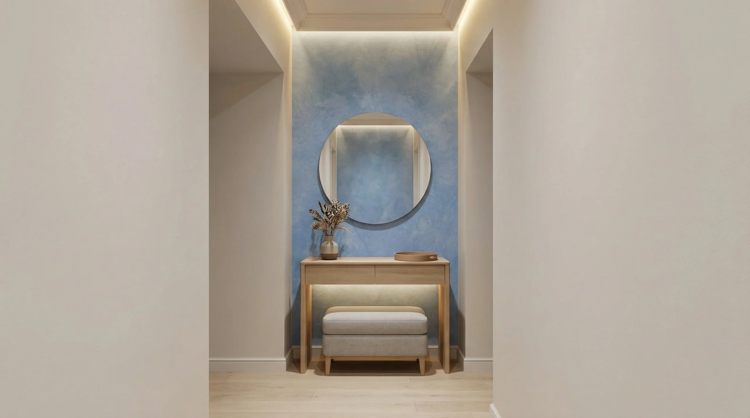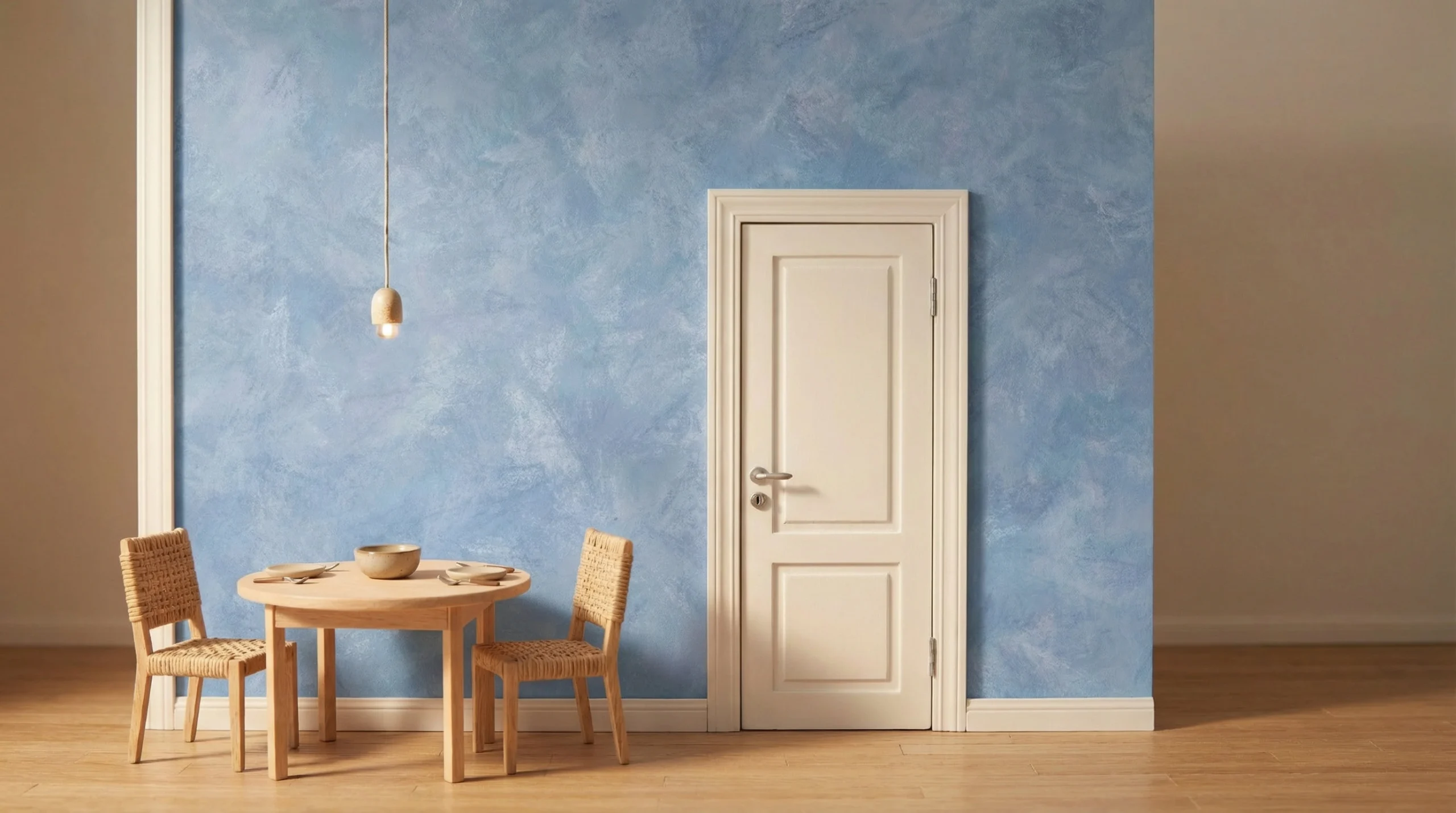 ✔ Hal/Eetkamer — In de hal werkt dit design prachtig als welkomaccent rondom een console of spiegel, gecombineerd met lichte vloeren en naturel accessoires. In de eetkamer geeft een blauwe accentwand achter een houten eettafel direct sfeer, zonder dat het ten koste gaat van de rust. Verf aangrenzende muren in een zacht linnen of warm wit voor een elegante overgang.