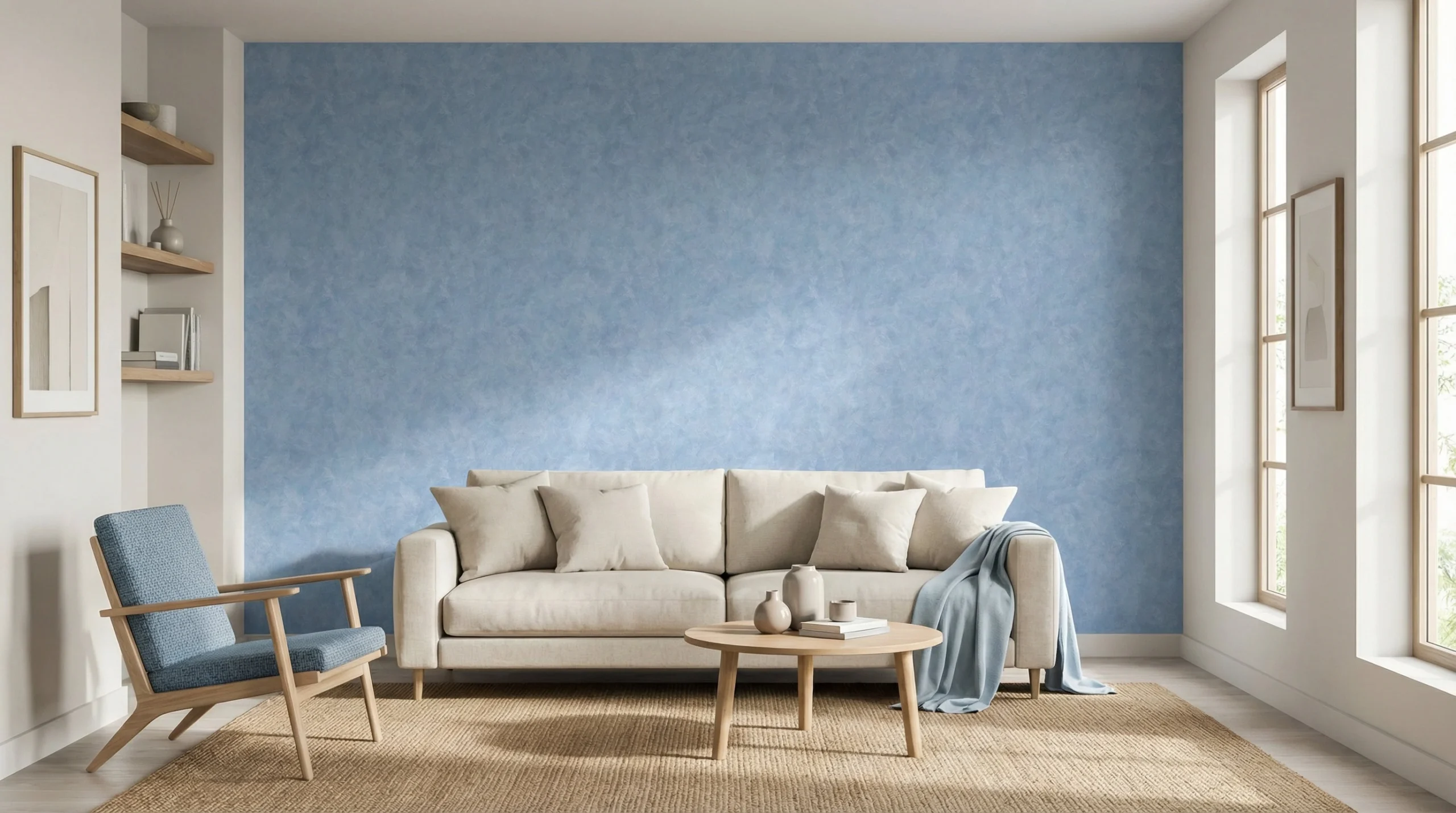 ✔ Woonkamer — Gebruik dit lichtblauw betonlook behang als accent muur achter de bank. Combineer met een comfortabele lichte bank, een juten vloerkleed en houten salontafel. Kies voor warm wit op de overige muren en voeg kussens in zand, grijs en zacht blauw toe voor een rustige, samenhangende zithoek.