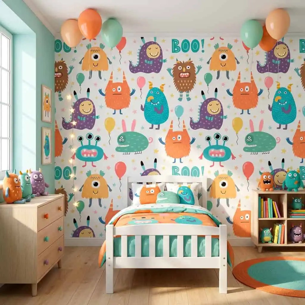 ✔ Kinderkamer – Geef de kamer van je kind een vrolijke accentwand achter het bed. De monsters en ballonnen zorgen voor een fantasierijke sfeer waarin spelen en dromen centraal staan.