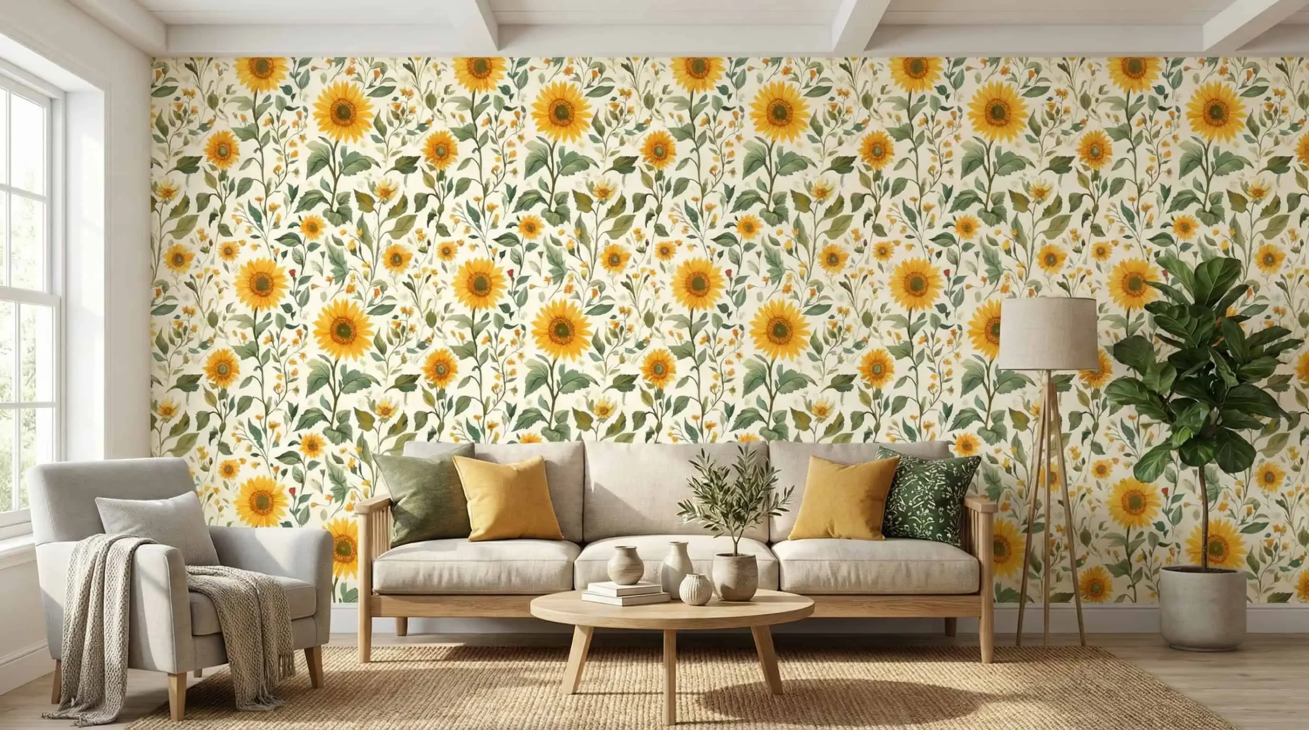 Dit natuurlijk zonnebloemen behang met heldergele bloemen en frisgroene bladeren brengt een levendige tuinsfeer naar je muur. Het naadloze behang wordt op maat gemaakt en door vakmensen professioneel gemonteerd.