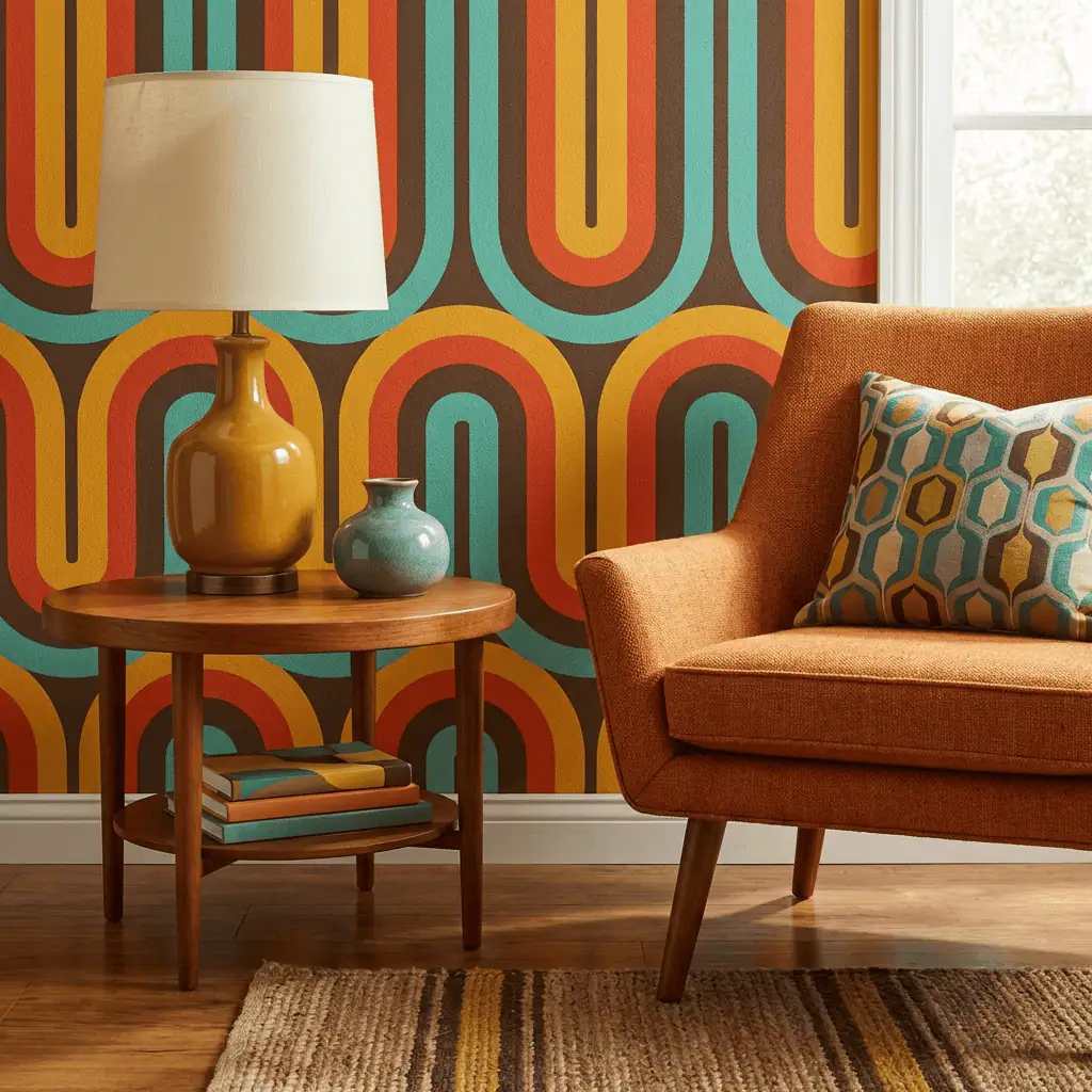 ✔ Woonkamer — Gebruik dit retro geometrisch behang op één grote accentmuur achter de bank. Combineer met een hoekbank in warm bruin of camel, kussens in oker en turquoise en een vloerkleed met subtiele structuur in zand- en crèmetinten. Verf de overige muren in warm wit of licht linnen voor rust.