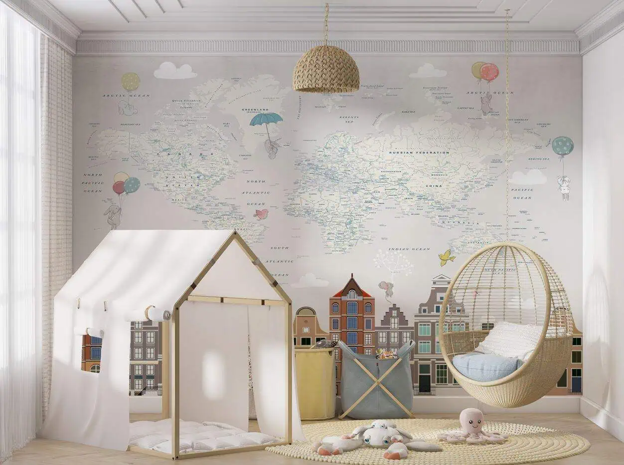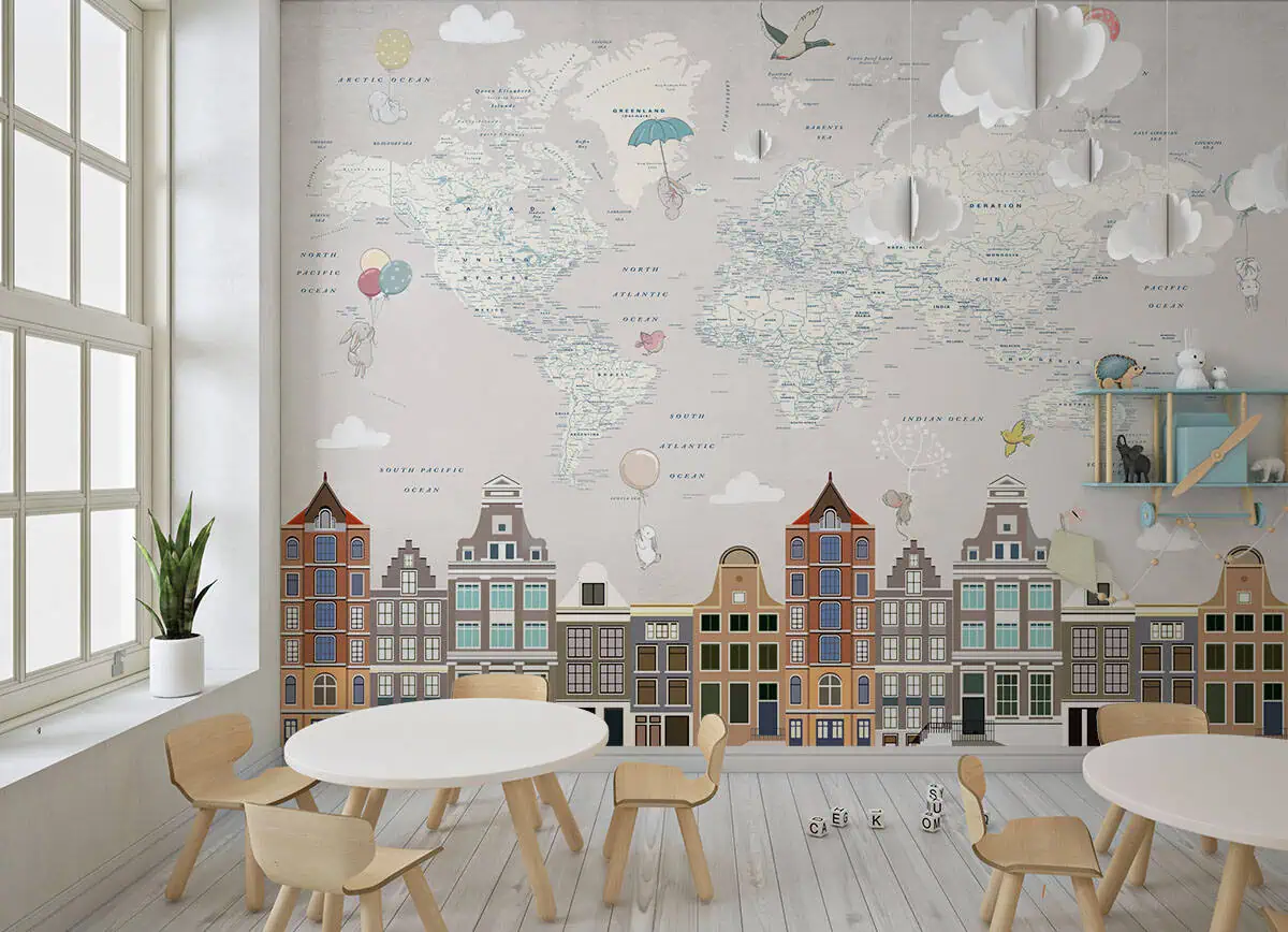 Het eerste wat opvalt is de rust in de basis: een licht grijze kaart met subtiele pastelaccenten. Daardoor blijft de kinderkamer kalm, terwijl er genoeg te ontdekken valt in elk hoekje van het fotobehang. Van continenten aanwijzen tot verhaaltjes verzinnen over de huisjes aan de gracht – deze wand wordt vanzelf het hart van de kamer.