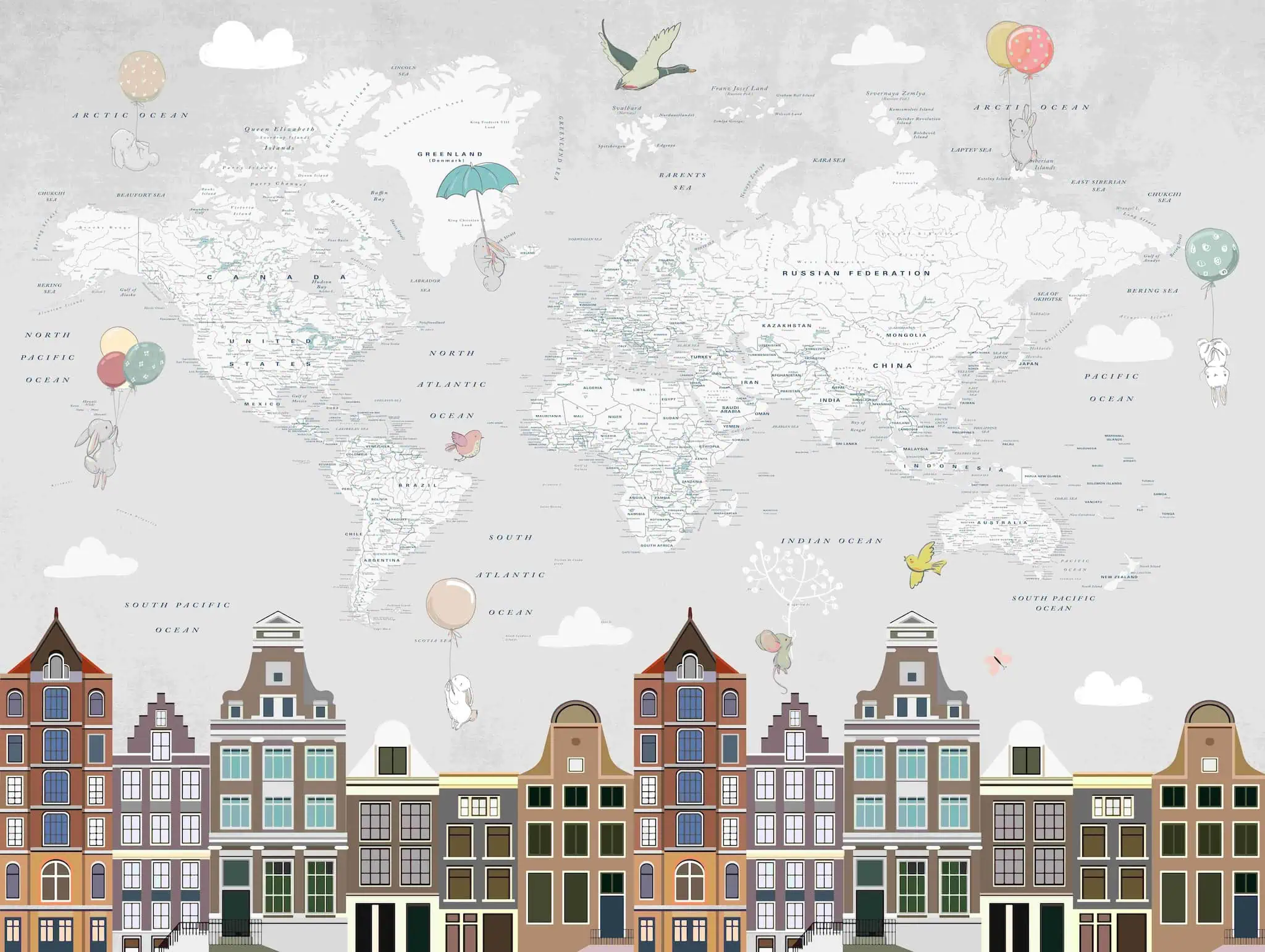 Boven de huisjes ontvouwt zich een grote wereldkaart in zachte grijs- en crèmetonen. De landmassa’s zijn helder omlijnd, met subtiel leesbare plaatsnamen, zeeën en oceanen. Tussen de continenten zweven schattige illustraties: konijntjes met ballonnen, een diertje onder een paraplu, vogels in vlucht en pluizige wolkjes. Daardoor oogt het geheel licht en dromerig, zonder te druk te worden.