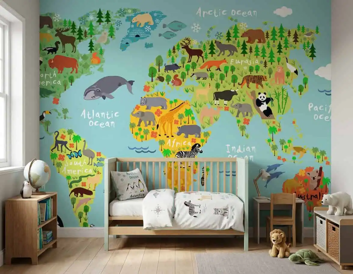 Wereldkaart Behang Dieren Heldere Kleuren voor Avontuurlijke Kinderkamers