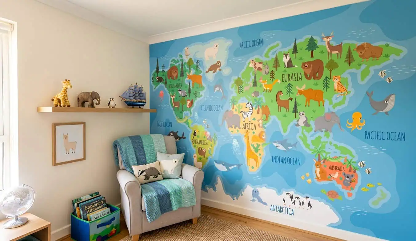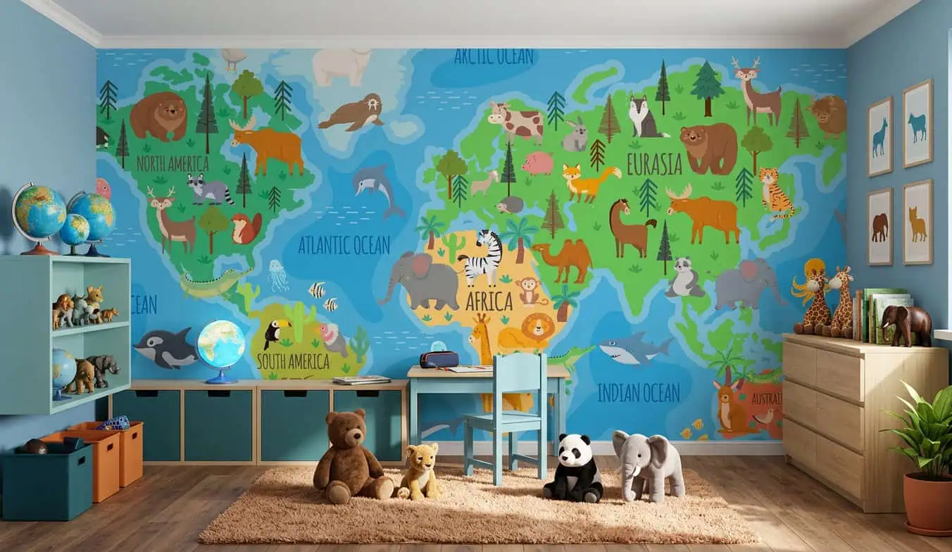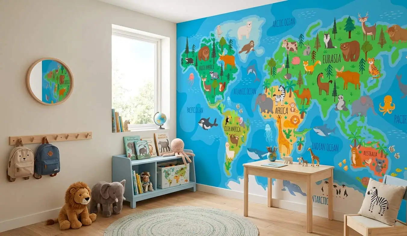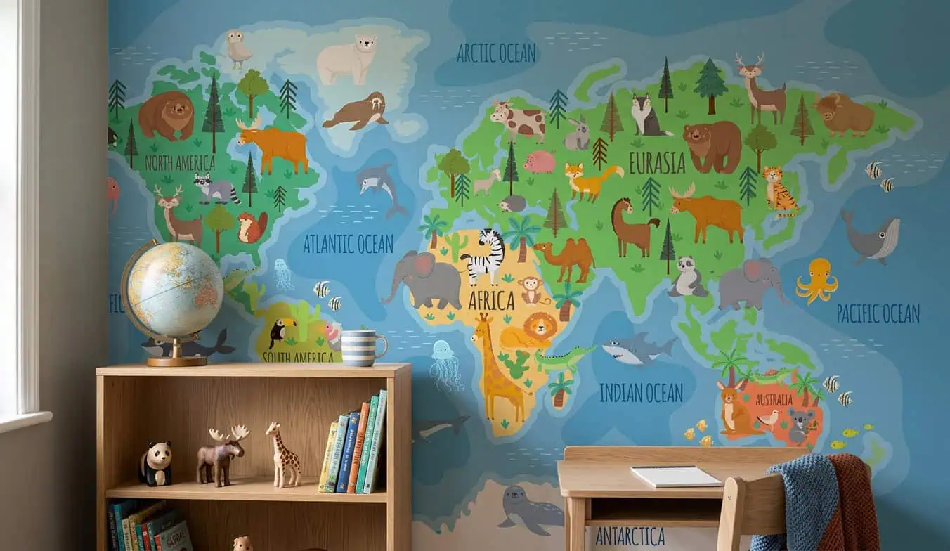 De frisse blauwtinten van de oceanen en de diepgroene continenten geven het wereldkaart behang dieren een sprankelende basis. Overal verschijnen vrolijke dieren: een leeuw in Afrika, een ijsbeer op de Noordpool, een orka in de oceaan. Elk dier spreekt tot de verbeelding en nodigt uit tot verhalen. De kleuren zijn helder, zonder te schreeuwerig te worden, waardoor het behang rust en vrolijkheid combineert. Dit behang past perfect bij naturelle houten meubels, zachte vloerkleden en accessoires in oker, mint of terracotta. Interieurstijlen waarin dit ontwerp schittert: