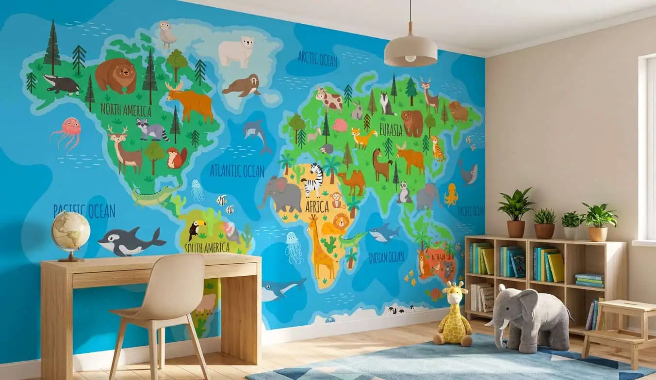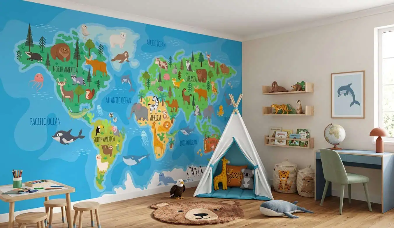 Laat jouw kind elke dag de wereld ontdekken met dit wereldkaart behang dieren in de kinderkamer of speelruimte. Vraag direct je offerte aan voor naadloos vliesbehang, volledig op maat en professioneel geplaatst door vakmensen.