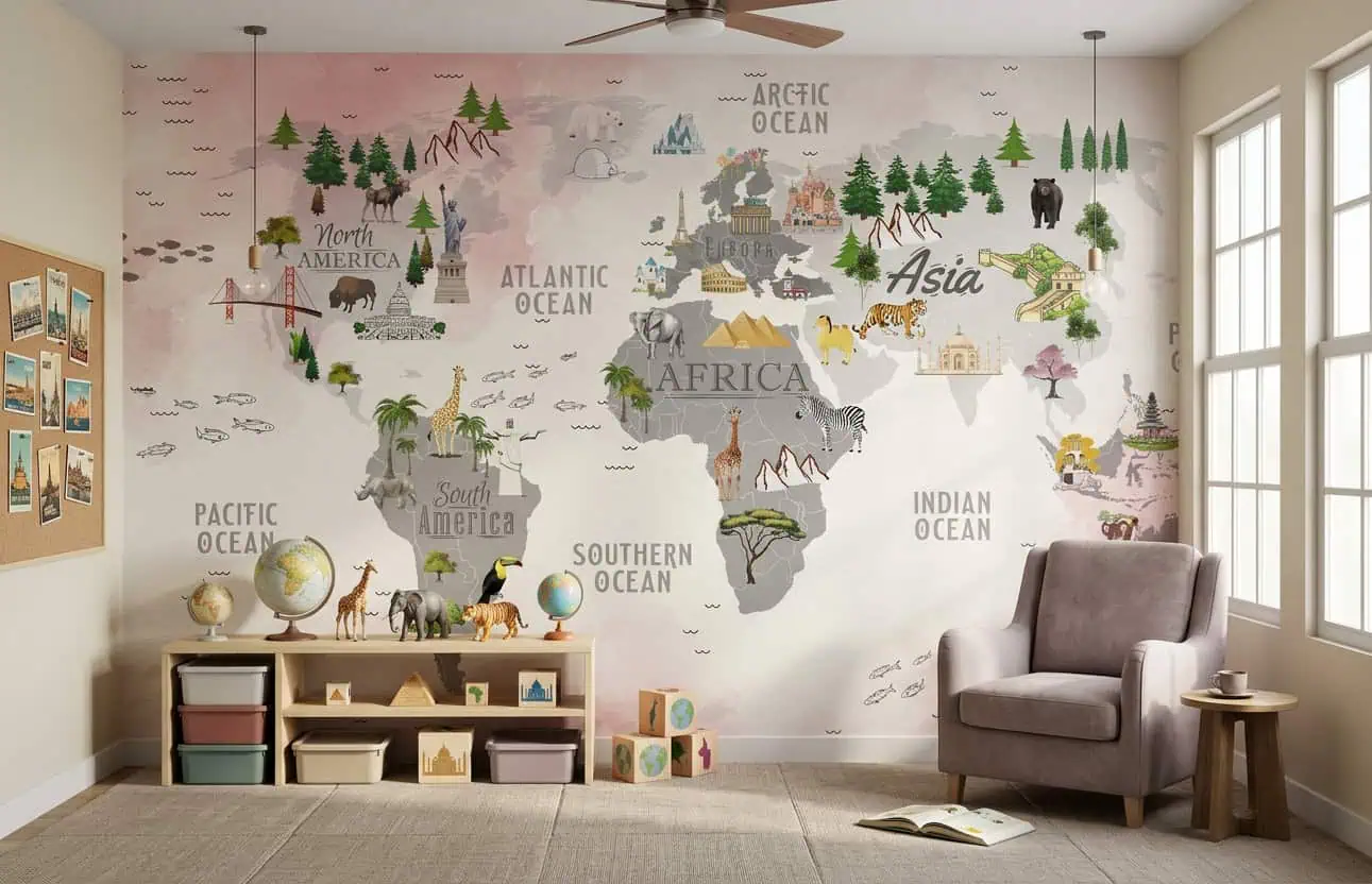 Wereldkaart behang voor kinderkamer, speelkamer en slaapkamer